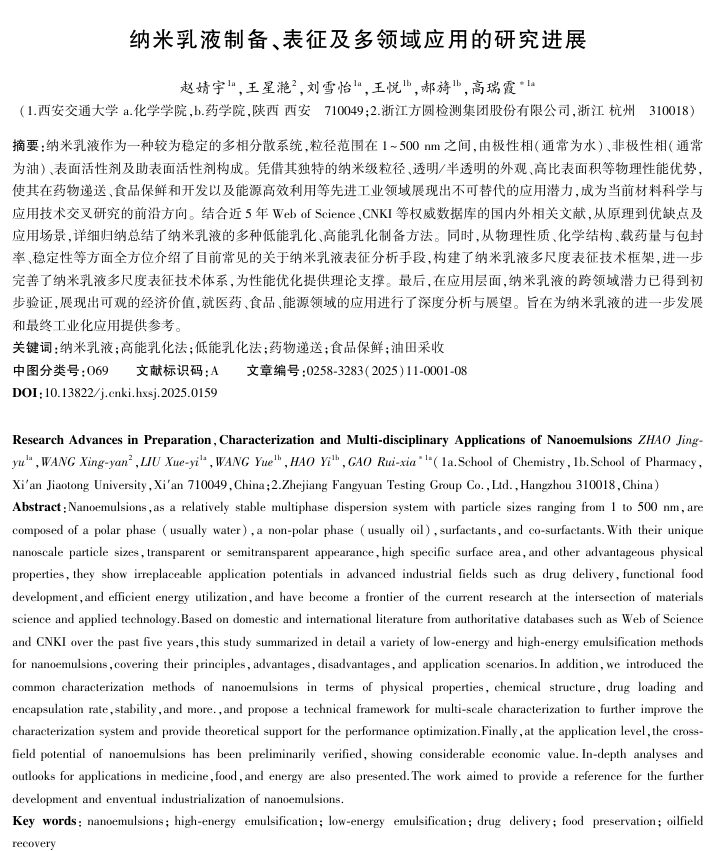 纳米乳液是粒径1~500 nm的多相分散系统,由极性相、非极性相、表面活性剂等构成,具有高透明度、高比表面积、强稳定性和流变性可调等突出特点。文章梳理高能与低能制备方法,对比优劣势;构建多尺度表征框架,涵盖物理性质、化学结构、药物释放动力学等分析;深度剖析其在医药、食品、能源领域的应用,为纳米乳液优化及工业化提供参考。