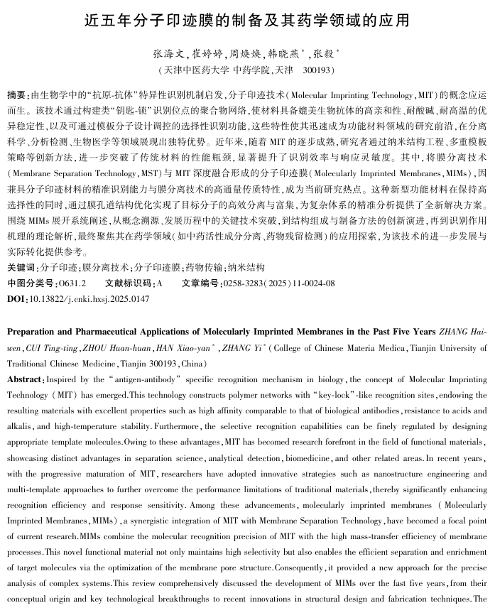受“抗原-抗体”特异性识别机制启发,分子印迹技术(MIT)应运而生。其构建类“钥匙-锁”识别位点的聚合物网络,兼具高亲和性、稳定性与可控选择性,成为功能材料研究前沿。近年经纳米结构工程等创新方法突破性能瓶颈后,MIT与膜分离技术融合形成的分子印迹膜(MIMs),因兼具精准识别与高通量传质特性成为研究热点,为复杂体系分析提供新方案。本文系统阐述MIMs的概念溯源、技术突破、制备创新及识别机理,聚焦其在药学领域的应用,为技术发展与实际转化提供参考。