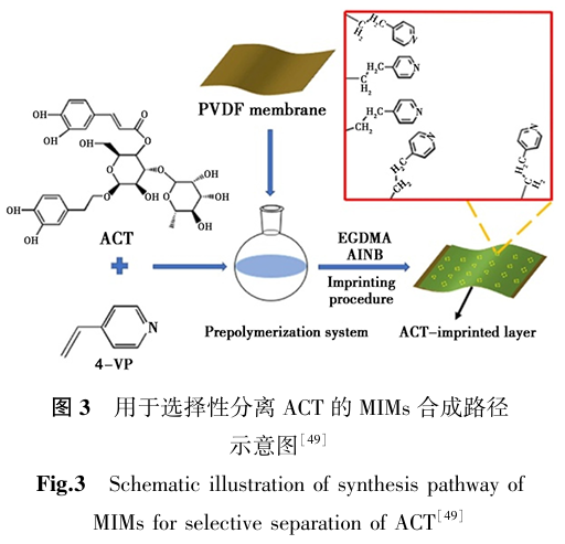 Zhao等[49]以聚偏氟乙烯(PVDF)膜为基膜,通过在氮气气氛中热引发的原位聚合反应合成了一类新型的微分子印迹聚合物,用于ACT的高选择性分离和富集。结果表明,该模型对于ACT,选择性因子为2.74,渗透系数超过2.66,具有较高的识别率和良好的稳定性。