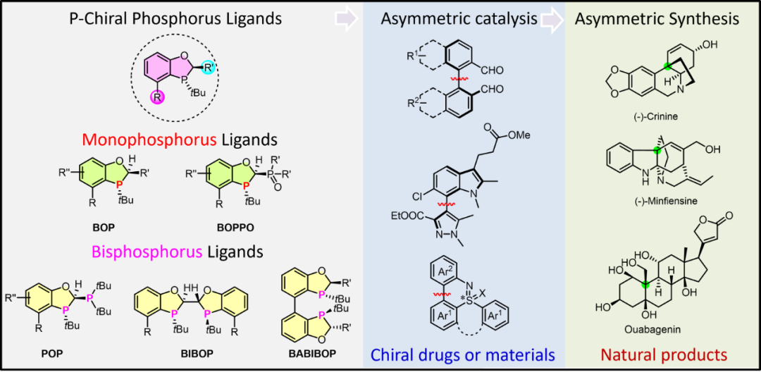 在现代药物合成尤其是手性药物的合成中,不对称催化技术是实现药物高效、规模化制备的核心,膦配体因其电子和空间位阻可调节性在不对称催化领域发挥着举足轻重的作用。虽然市场上有部分膦配体得到工业化应用,如具有轴手性的联萘基骨架膦配体和面手性的二茂铁骨架膦配体,但大多对空气较为敏感且结构难以修饰,而磷手性二氢苯并氧杂膦烷配体是一类大位阻、富电子、结构可调且性质稳定的膦配体,在众多有机转化中表现优异且呈现独特的催化特性,在KRAS轴手性药物的制备中表现尤为突出。因此,总结该类配体在众多催化反应及合成中的应用显得很合时宜。