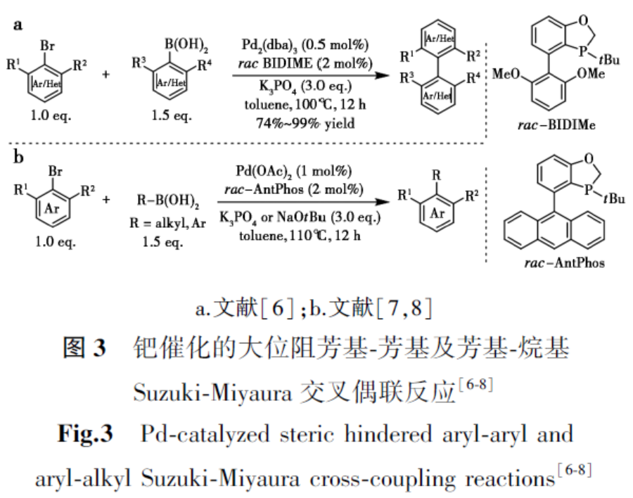 过去数十年间,关于大位阻Suzuki-Miyaura交叉偶联反应的研究成果较为有限。Buchwald团队曾报道使用菲罗啉单膦配体通过Suzuki-Miyaura交叉偶联构建四邻甲基取代联芳烃的方法,但该策略中两个邻位取代基仅限于甲基。2010年,Tang等[6]利用二氢苯并氧杂膦烷配体BIDIME或AntPhos,在低催化剂负载量下成功实现了邻位四取代联芳烃的合成(图3a)。值得注意的是,该方法可兼容异丙基、异丙氧基等大位阻取代基,收率最高达99%。随后,通过使用相同催化剂体系,进一步实现了邻位双取代卤代芳烃与仲烷基硼酸之间的大位阻芳基-烷基Suzuki-Miyaura偶联。该方法的高效性在分子齿轮化合物的合成中得到充分验证,以优异收率获得目标产物(图3b)[7,8]。