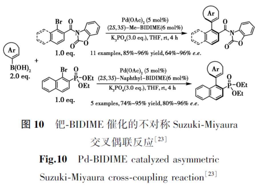轴手性联芳烃结构广泛存在于多种生物活性天然产物和药物活性成分中[20,21]。不对称Suzuki-Miyaura交叉偶联仍是构建多样化轴手性联芳烃最直接、通用且经济高效的方法[22]。2012年,Tang等[23]报道了采用2-取代BIDIME手性配体,通过钯催化不对称Suzuki-Miyaura偶联反应高效构建系列功能化手性联芳烃的新方法(图10),该反应兼具高收率与优异对映选择性(e.e.值高达96%)。