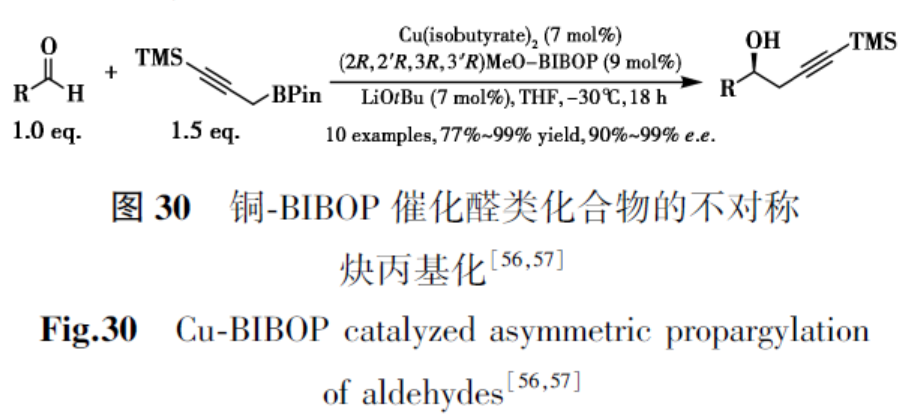 2010年,Fandrick等[56]报道了使用MeO-BIBOP作为配体,铜催化醛与丙炔基硼烷试剂的高效不对称丙炔基化,以优异收率和对映选择性(90%~99% e.e.)提供了一系列手性高炔丙醇(图30)。该方法显示出广泛的底物范围,包括芳基、杂芳基、烯基和烷基醛。Trost及其合作者进一步将该方法应用于bryostatin 3的全合成,对烯醛进行丙炔基化,收率和对映选择性优异(86%,98% e.e.)[57]。