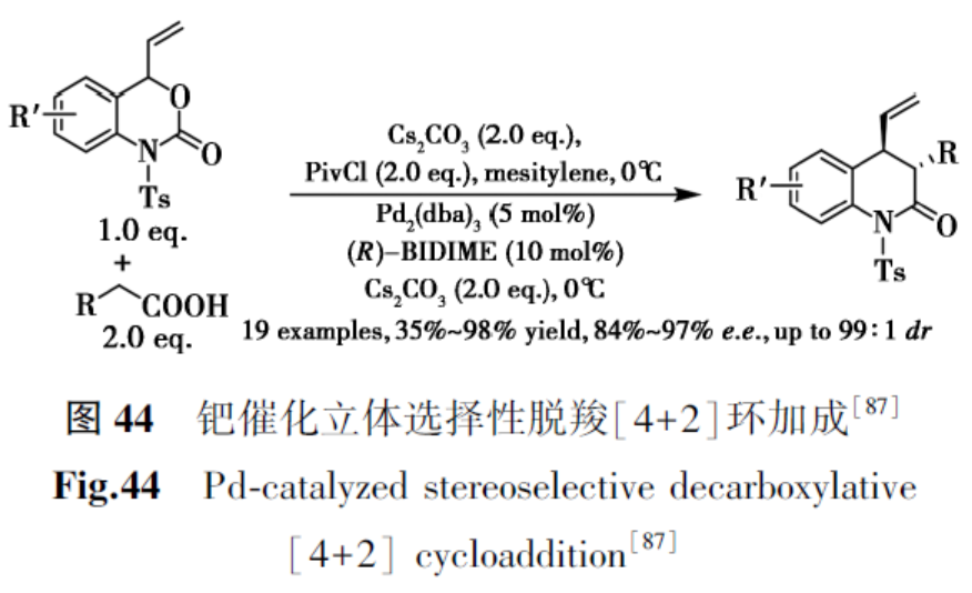 Deng等[87]报道了使用BIDIME作为配体,钯催化4-乙烯基苯并噁嗪酮与羧酸的选择性脱羧[4+2]环加成,以中等至良好收率和良好至优异的立体选择性提供了一系列结构多样的带有两个连续手性中心的3,4-二氢喹啉-2-酮(图44)。