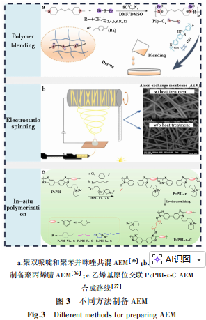 AEM作为电化学系统中的关键部件。其效率和稳定性等性能的影响对系统的影响是关键的。而不同的合成方法对与膜的性能和商业化有着很大的影响。目前在eCO2RR中AEM的合成主要通过聚合物共混、静电纺丝等方法实现[35-37]。