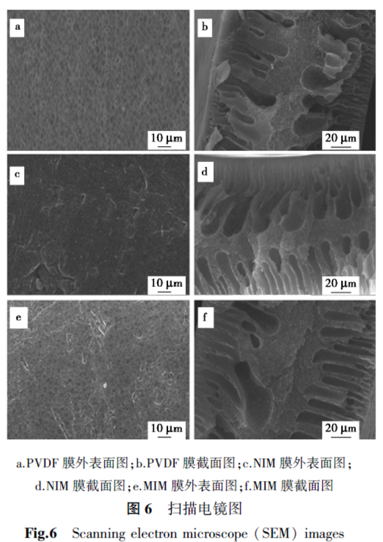 图6中分别给出了3种膜(PVDF膜、MIM膜、NIM膜)的表面和截面的扫描电镜图。如图6所示,图6a、6c、6e为膜表面形态,从图6a可见空白基膜表面粗糙且有明显孔径,经过分子印迹聚合改性后,NIM和MIM膜表面更密实,孔径消失。图6b、6d、6f是膜的截面图,空白基膜厚约156 μm,印迹后膜厚184和190 μm,这充分表明,在基膜表面形成了均匀的印迹层,为后续膜材料发挥良好性能奠定了基础。