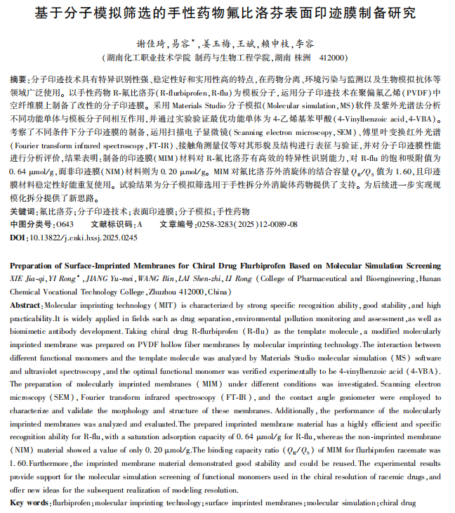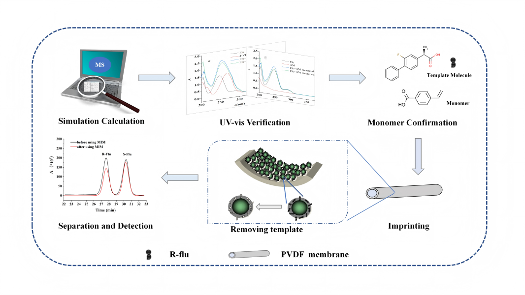 手性药物的高效拆分是制药领域的关键技术难题,直接关系药物疗效与安全性。分子印迹技术凭借特异识别性强、稳定性好、实用性高的核心优势,已成为手性分离领域的研究热点,在药物分离、环境监测、生物模拟抗体等场景中广泛应用。氟比洛芬作为重要手性药物,近期研究表明其R型对于海尔默兹病(即老年痴呆)显现出了良好的治疗效果,其高效分离提纯需求迫切。亟需开发新型高效的手性分离材料。基于此,研究团队以R - 氟比洛芬为模板分子,结合分子印迹技术与聚偏氟乙烯中空纤维膜改性,为手性药物拆分提供新路径。