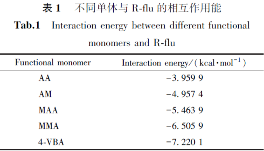 R-flu与AA、AM、MAA、MMA和4-VBA 5种单体的相互作用能模拟计算结果如表1所示。
