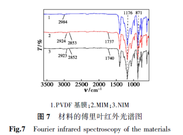 如图7所示。由于PVDF傅里叶红外光谱的背景吸收很强,在500~1 400 cm-1范围内,曲线1、2和3的信号几乎一致:在1 176和871 cm-1处的峰分别对应了基膜中—CF2—的拉伸和变形振动,2 984 cm-1处弱的吸收峰来自于—CH2—的伸缩振动,表明3组材料均含PVDF。通过对比发现,曲线2在1 737 cm-1处出现了新的吸收峰,曲线3在 1 740 cm-1处出现了吸收峰,这是功能单体4-VP中羧基的C=O伸缩振动吸收峰,表明单体成功地修饰到基膜上。曲线2中,在约 2 924和 2 853 cm-1处出现了2个弱的吸收峰,这是高分子聚合物链上CH3的不对称和对称伸缩振动。比较曲线2和3,典型吸收峰的位置和强度略有不同,这可能是受模板分子与单体间的作用影响导致,综述以上吸收峰的变化,表明印迹层已成功涂覆于PVDF表面。