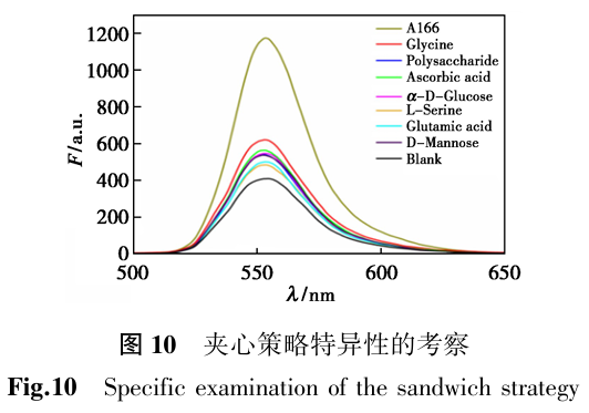 为评估该策略靶向A166的特异性,采用夹心策略检测A166及其干扰物。配制成相同浓度与MIP-A166进行反应,然后加入HR6GGO进行标记,反应后加入甲醇释放出荧光信号,测荧光强度,结果如图10所示。