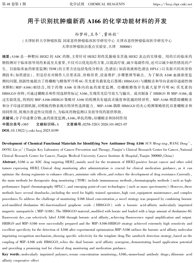 印迹材料是一类具有高度特异性识别能力的人工合成材料,物理化学稳定性好,耐高温、酸碱和有机溶剂,制备成本低,可重复使用。在分析检测、医疗健康和环境保护方面应用广泛。A166是一种靶向治疗HER2阳性肿瘤的药物,实现对药物的在体内的浓度监测可以帮助医生在疗效与安全性之间找到最佳平衡点。现有的质谱、高效液相色谱等方法具有成本高,操作繁琐的缺点,所以提升监测的便利性,降低成本至关重要。通过特异性捕获A166的印迹材料的制备,可以帮助我们实现用药后A166浓度的监测,对临床用药具有重要意义。