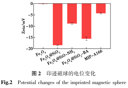表面电荷的变化也可以表明MIP-A166印迹磁球的成功制备,如图2所示。