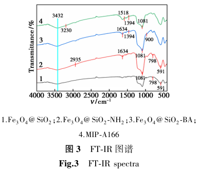 通过傅里叶变换红外光谱进一步证明了MIP-A166的成功制备,图3曲线1是MIP-A166的红外光谱图。