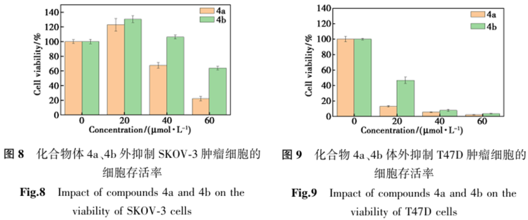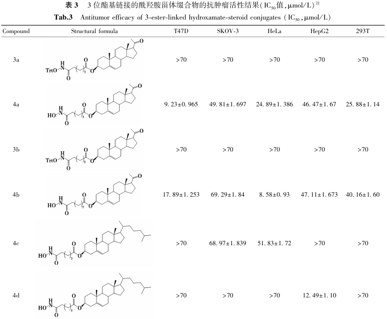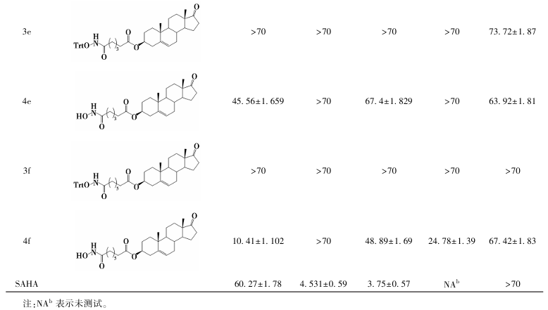 构效关系研究(表3、图8、图9)表明:1)胆甾烷结构支链的缀合物未显示肿瘤细胞抑制活性;2)对于孕烯醇酮缀合物,活性随支链碳原子数增加而减弱(化合物4a>4b);而对于去氢表雄酮缀合物,活性则随碳链增长而增强(化合物4e<4f);3)在相同取代基下,去氢表雄酮缀合物的细胞毒性优于孕烯醇酮缀合物;4)三苯甲基保护的酰羟胺前体无抗肿瘤活性,脱除保护基后的终产物均表现出良好活性,且部分化合物对T47D细胞的抑制活性显著优于其他测试细胞系。