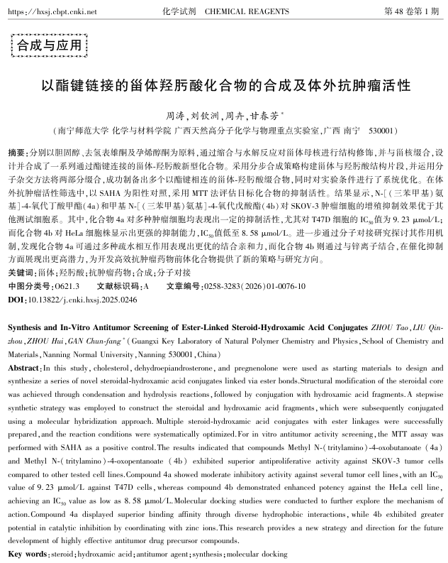 恶性肿瘤是全球重大健康挑战,现有疗法在疗效与毒性方面仍有局限。甾体化合物因其良好的生物相容性与多样生理活性,已成为抗肿瘤药物设计的重要骨架;而羟肟酸作为组蛋白去乙酰化酶(HDAC)抑制剂,在肿瘤治疗中显示出广阔前景。本研究基于“分子杂交”策略,将甾体与羟肟酸通过酯键缀合,构建了一系列结构新颖的甾体-羟肟酸缀合物,旨在开发兼具高活性与低毒性的抗肿瘤候选分子。