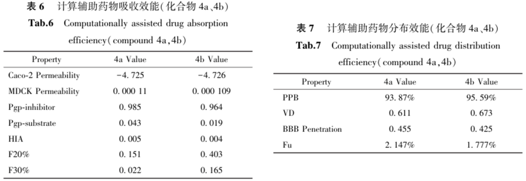 通过计算机辅助ADMET计算,对化合物4a和4b的吸收与分布性质进行了评估(表6、表7)。