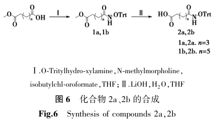 首先构建羟肟酸片段。以己二酸单乙酯和辛二酸单甲酯为原料,通过缩合反应及碱性水解法,合成氧代三苯甲基保护的胺基己酸、胺基辛酸及4-氧-(氧代三苯甲基-胺基)-苯甲酸中间体(图6)。