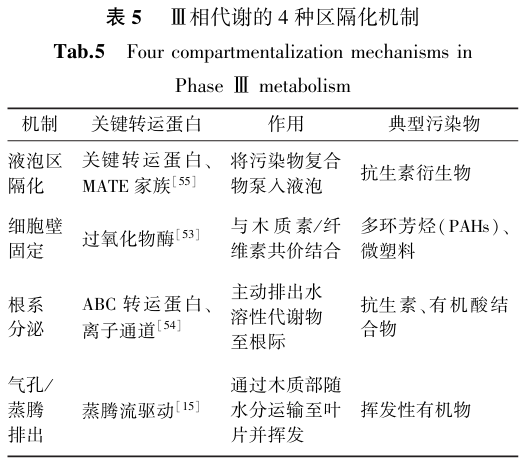 植物的III相代谢是其在应对污染物胁迫后的一项重要解毒机制[43],其主要功能是将经过Ⅱ相代谢修饰的结合态代谢产物进行区室化隔离或排出体外,从而最大限度地降低这些物质对细胞正常生理过程的干扰。根据现有研究,植物通常通过以下4种主要机制实现污染物的区室化(表5)。