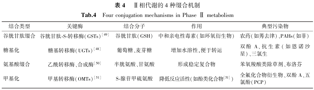 II 相代谢(又称缀合反应)是污染物在植物体内代谢转化的重要阶段。该过程主要将 I 相代谢(如氧化、还原和水解)所生成的中间代谢产物与内源性小分子进行偶联[48],从而进一步降低其生物毒性,并显著增强其水溶性,使其更容易通过气孔或根系分泌物等方式排出体外,减少在植物体内的积累。II 相代谢主要包括4种缀合机制(见表4)。