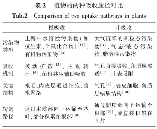 植物根系不仅是吸收水分和矿物元素的器官,也是吸收药品和个人护理用品(PPCPs)、全氟和多氟烷基物质(PFAS)等新污染物的主要器官[21]。2.2 叶吸收与转运