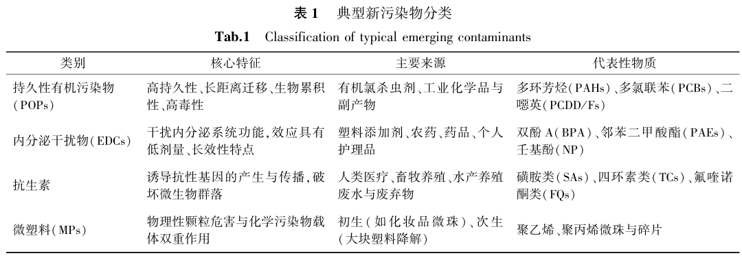 新污染物可分为持久性有机污染物(POPs)、内分泌干扰物(EDCs)、抗生素以及微塑料(MPs)4类。