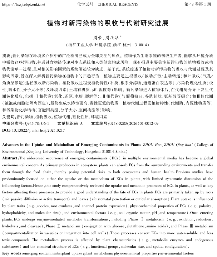 植物在新污染物从非生物圈进入生物圈的过程中扮演关键角色,其吸收与代谢机制表现出高度复杂性与多样性,受到植物物种特性、污染物理化性质以及环境条件等多重因素的调控。植物通过根或叶界面吸收新污染物后,借助多阶段的酶促代谢反应实现其转化、缀合与隔离,显著影响污染物在环境中的归趋与生态风险。然而,当前研究仍面临一些挑战,如实际环境中多因素(如光照、温度、土壤性质及微生物等)协同下的植物吸收与代谢机制待深入探究、新污染物的植物代谢产物毒性效应尚不明确。因此,未来研究需从实验室单一控制实验转向多因子正交实验和野外验证相结合,同时应重点关注植物代谢产物的种类、转化路径及其毒性效应,通过体外体内毒理实验评估其环境与健康风险。