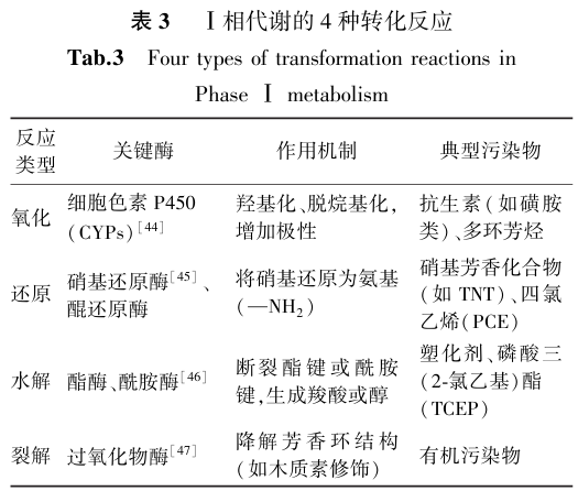 I 相代谢是植物对外源污染物进行生物转化的起始阶段[41]。在该过程中,母体污染物通过一系列酶促反应(主要包括氧化、还原和水解)发生结构修饰,生成带有羟基、羧基、氨基等极性官能团或反应活性位点的中间代谢产物。