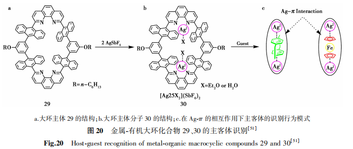 Shionoya小组在含金属-蒽大环化合物的合成及其识别性能方面有独特的研究。2014年,该小组报道了一种构建的基于双核金属银-蒽大环化合物[51]。该大环含有4个蒽分子结构单元,由2个邻二氮杂菲分子连接。2个银原子处于大环29的空腔内部,与空腔内部的N原子鳌合形成稳定的结构30。实验研究发现,即使在浓度为30 μmol/L的氘代氯仿溶剂中,二聚对二甲苯、二茂铁等客体分子可以很好的进入大环主体分子30的内部,在Ag−π 的相互作用下主客体间依然有较好的识别行为(图 20)。不仅如此,该小组还研究了金属-有机含蒽大环主体30与具有平面结构的蒽分子,非平面结构的三叠烯分子的识别性能[52, 53]。