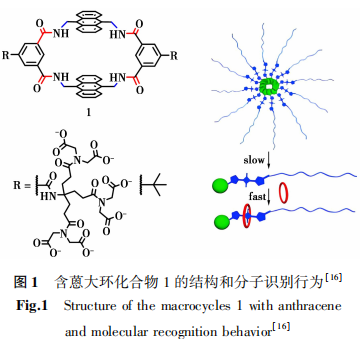 由有机官能团(酰胺键、醚氧键、脲键、硫脲键、席夫碱、炔键等)与蒽分子连接而成的大环化合物,其结构中不仅含有蒽分子较大的疏水刚性平面和较强的荧光特性,而且还具有有机官能团的性能。与其它的超分子主体相比,有机含蒽大环化合物可以为主体提供额外的分子间大π键,以增强其分子识别以及自组装等方面的特性[17,18]。