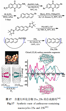 Du等[45]研究了一系列由芳香环构建的大环化合物的纳米管的光电性能。2020年,该小组以2,6-二氨基蒽醌为反应原料,经过多步反应选择性的合成了成对的含蒽手性大环化合物25a、25b,它们都具有较强的荧光吸收和较大的光致发光红移现象(图17)。