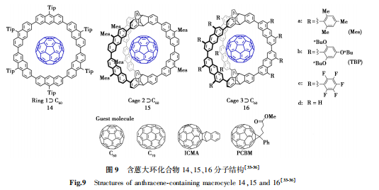 此外,Toyota通过Suzuki-Miyaura耦合和Yamamoto耦合两个耦合反应,合成了由Ant单元和Trip单元组成的3个大环笼(化合物14、15、16)。通过1HNMR和荧光光谱证实,这些笼子与富勒烯客体形成物质的量之比为1:1的包合物。由于非共价相互作用的增加,笼对C70客体相对于C60客体和功能化C60具有较高的亲和力(图9)[33-36] 。
