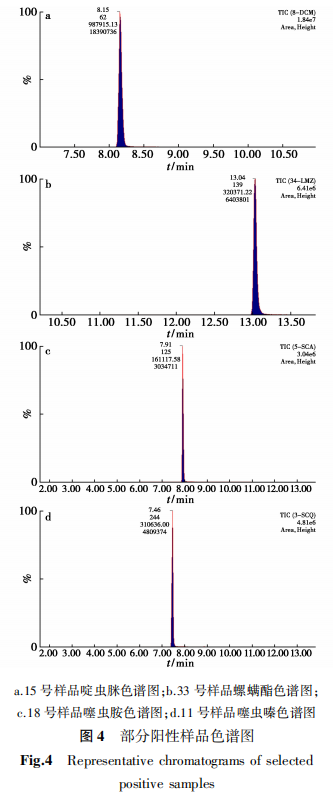 本研究采集了103份蔬菜水果样品,样品均来自于青海省各区县各大农贸市场及超市,结果显示部分样品的啶虫脒、噻虫嗪、噻虫胺、乙螨唑等均有检出。阳性样本经过二次复检,通过对保留时间和特征离子比率比进行了复核,并且报上级机构实验室进行了比对,相对相差<20%,部分阳性样本碎片离子色谱图如图4所示,根据国家标准GB2763-2021《食品安全国家标准食品中农药最大残留限量》[21]均小于国家限量。