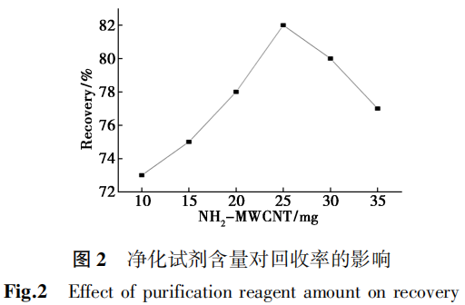 在研究了每mL提取液中组合使用了PSA+氨基化多壁碳纳米管+MgSO4进行回收率实验后,通过加入50 mg的PSA、150 mg的MgSO4和分别加入10、15、20、25、30、35 mg的氨基化多壁碳纳米管进行对比实验,如图2所示。