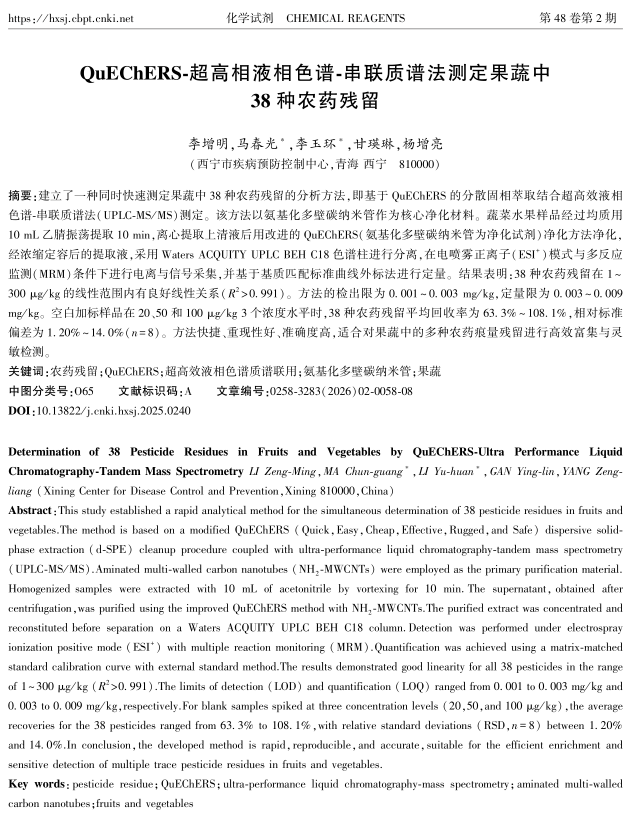 本研究构建了一个高效的分析体系:通过采用氨基化多壁碳纳米管改进QuEChERS前处理净化效果,并利用超高效液相色谱-串联质谱技术,实现了果蔬样品中38种农药残留的同步、快速分析。并且通过优化提取试剂、净化试剂、仪器条件等方式有效地提高了方法的回收率,降低了基质效应的影响。本方法准确、快速、灵敏度高,为蔬菜水果中农药残留的检测提供了方法参考,为市场监管有效管理提供了技术支撑。