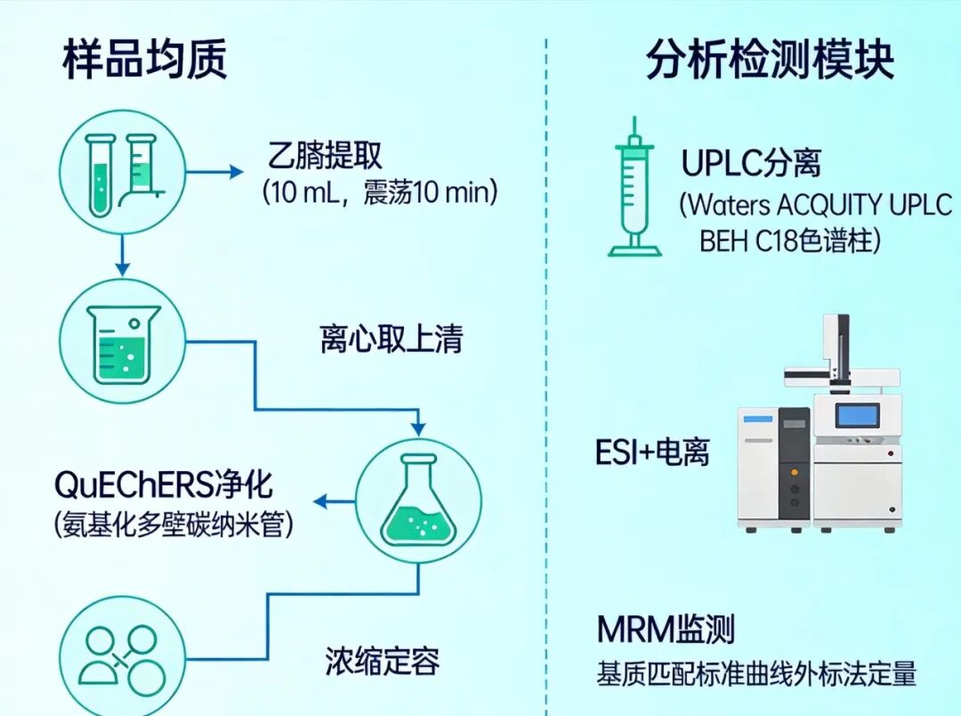 果蔬中农药多残留的高通量筛查是食品安全检测的重要环节。传统前处理方法常存在步骤繁琐、净化效果有限或检测通量低等问题,难以满足多种农药痕量残留的快速分析需求。QuEChERS方法虽已广泛应用,但其净化材料的选择直接影响方法的回收率与抗基质干扰能力。因此,开发高效、选择性强的净化材料,并建立与之匹配的快速、灵敏的多残留检测方法,对保障果蔬食用安全与提升检测效率具有重要意义。