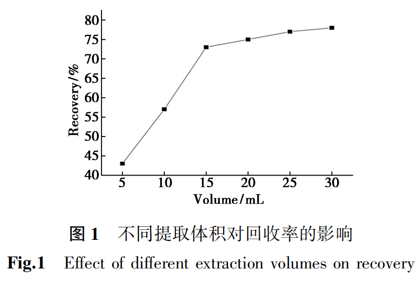 本实验分别用10 mL的乙酸乙酯、甲醇、乙腈作为提取试剂,结果发现乙腈作为提取试剂时,回收率在80%~120%之间的农药占比较多,可达到90%以上。因此,本实验选定乙腈作为提取溶剂。为优化提取效率,考察了10 g空白基质中乙腈用量(10、15、20、25、30 mL)对目标农药回收率的影响如图1所示。