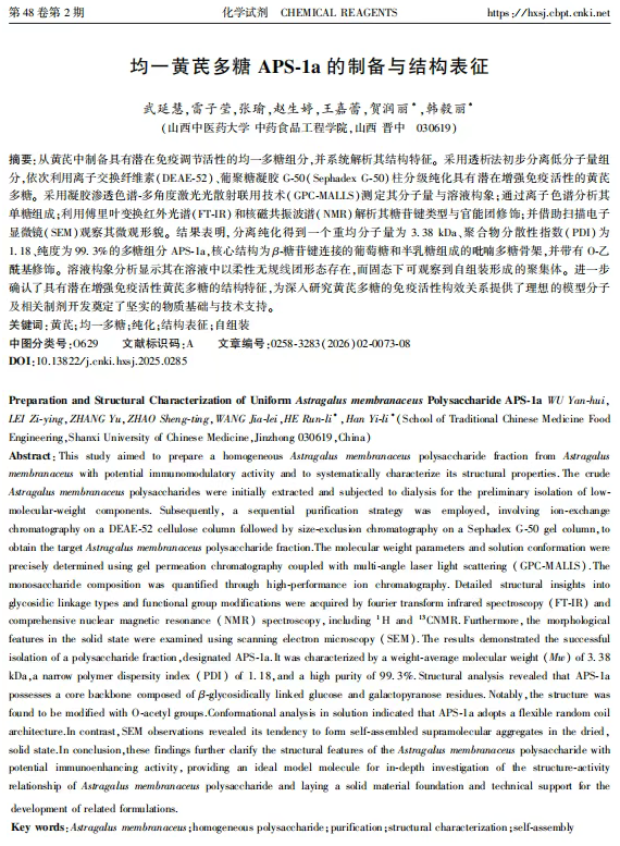 本研究经分离纯化首次得到一种分子量为3.38 kDa,以葡萄糖为主的均一黄芪多糖APS-1a,测定结果明确揭示,APS-1a具有以β-糖苷键连接的葡萄糖-半乳糖吡喃环骨架及特有的O-乙酰基修饰,且其高度的结构均一性(PDI=1.18)与明确的溶液构象为其功能研究奠定了基础。是否可以通过调控其乙酰化修饰或分子组装行为来定向增强其免疫调节活性,这为黄芪多糖的靶向制备与结构优化提供了新的研究方向。同时本实验为深入解析黄芪多糖的构效关系及开发其作为新型免疫调节试剂或先导化合物奠定了坚实的物质与理论基础。