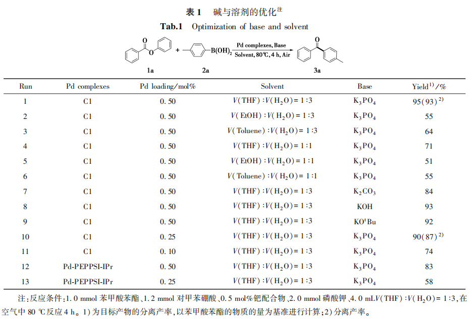 在1.0 mmol苯甲酸苯酯、1.2 mmol对甲基苯硼酸、2.0 mmol碱、0.5 mol%催化剂 C1及4 mL溶剂的条件下,以化合物3a为例,系统研究了不同反应参数对催化效率的影响。如表1所示,溶剂与碱的组合对反应产率起着至关重要的作用。