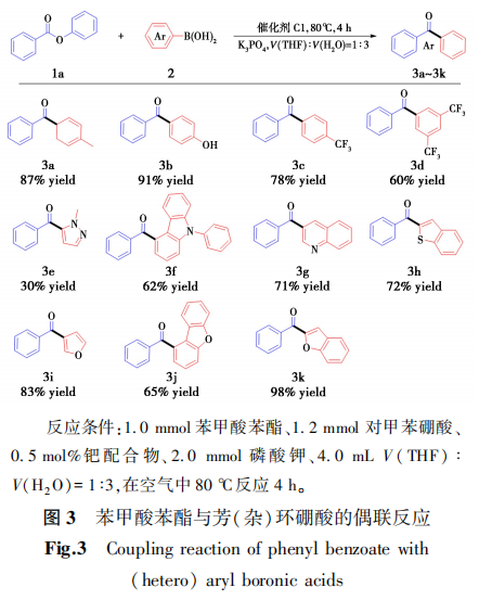 将一系列的芳(杂)酯与芳硼酸进行交叉偶联化反应(图3)。首先,拓展芳基硼酸的适用范围。随后,对酯类底物的范围进行拓展。