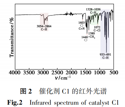 配合物 C1红外光谱如图2所示,在3054~2864 cm-1区域可观察到 C–H 伸缩振动吸收峰;1603 和 1446 cm-1处对应芳环骨架振动,其中 1603 cm-1处同时包含C=N伸缩振动特征吸收;1380 cm⁻¹ 处的吸收峰可归属于 –CH₃的弯曲振动;1328~1036 cm-1区间为 C-H 面内弯曲振动。1072 cm-1处出现的吸收峰可归属于 C-Cl 的伸缩振动;而 933~691 cm-1区域则对应 C-H 的面外弯曲振动。上述特征吸收峰的出现表明氮杂环卡宾配体已成功与钯中心发生配位。综合 NMR 与 IR 表征结果,可以确认目标配合物C1的成功合成及其结构的正确性。