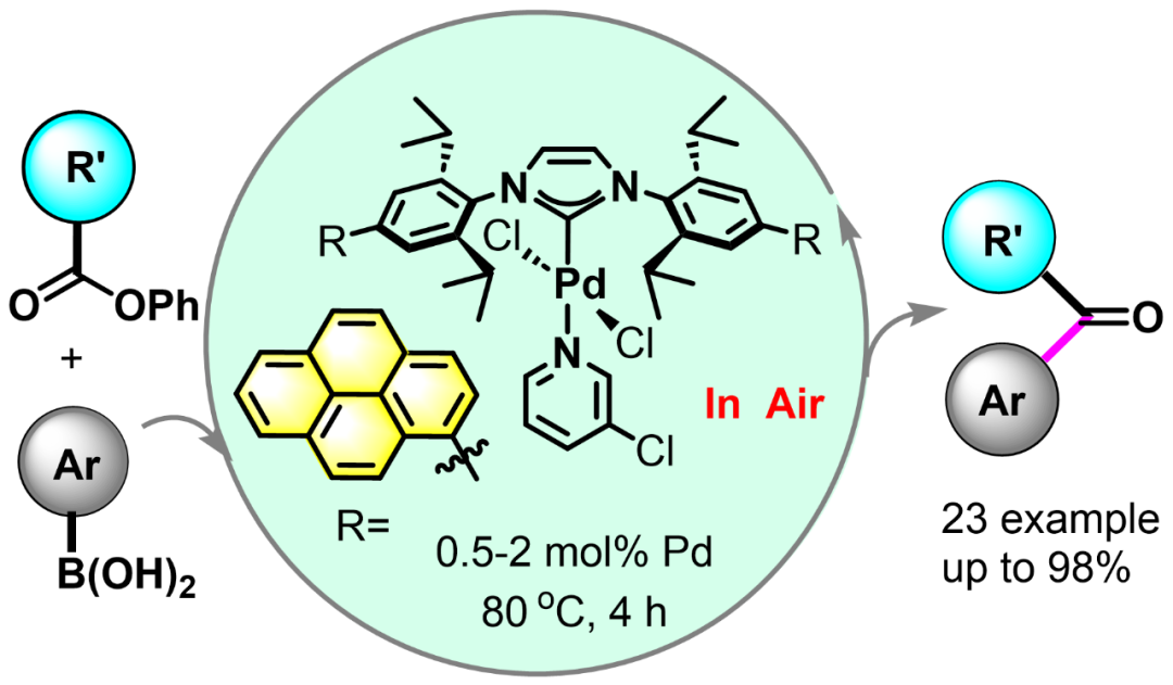 芳酮结构广泛存在于医药和天然产物中,其高效构建一直是有机合成的研究重点。Suzuki偶联是构建C-C键的重要方法,但传统反应多采用卤代芳烃,存在毒性高、成本大等问题。近年来,芳基酯因来源广泛、环境友好而成为理想的卤代芳烃替代物。尽管氮杂环卡宾配体在过渡金属催化中优势显著,但在芳基酯参与的Suzuki反应中应用有限,尤其涉及杂环底物时高效催化体系更为罕见,是当前亟待解决的关键问题。