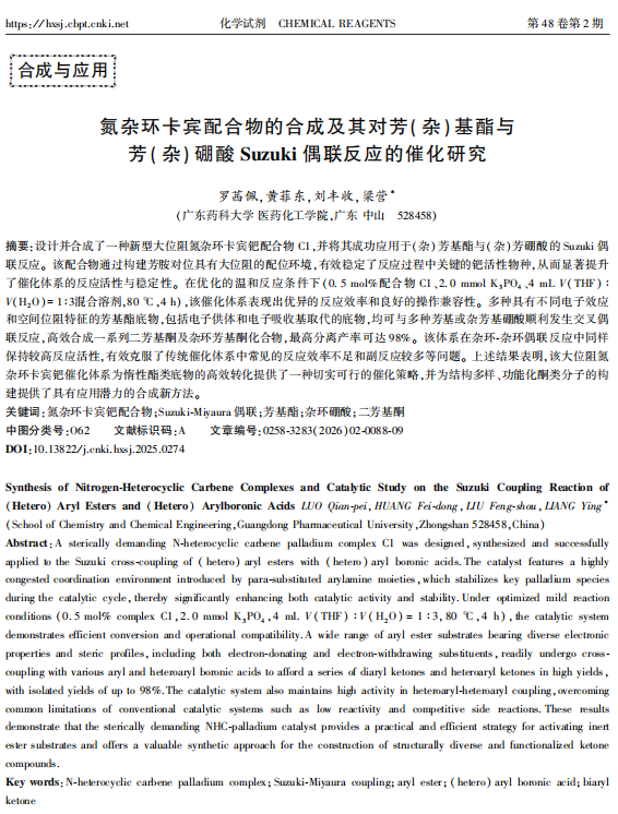 本研究设计并合成一种新型的大位阻氮杂环卡宾钯配合物,在卡宾咪唑环的侧链的芳基对位上引入芘基基团,能够提高其供电子能力,增大空间位阻,芘基处在芳环对位,离钯中心较远,使能够更好的稳定钯中心,利于催化反应的进行。该配合物在催化芳基酯与芳(杂)硼酸的Suzuki偶联反应中表现出卓越的催化活性和稳定性,底物范围包括多种杂环硼酸以及带有不同电子效应和位阻的芳基酯。研究为合成结构多样的二芳酮及杂环芳酮类化合物提供高效、可靠的新方法,为Suzuki偶联反应的应用扩展提供重要的指导意义。