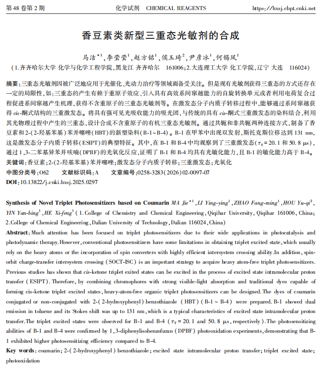3. 马洁, 李莹莹, 赵方铭, 侯玉琦, 尹彦冰, 何锡凤.香豆素类新型三重态光敏剂的合成,化学试剂, 2026, 48(2):97-103.