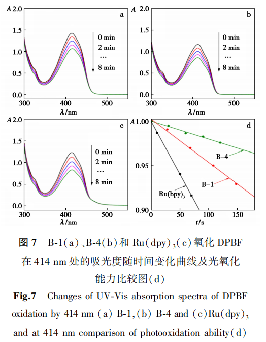 为了验证B-1和B-4敏化单线态氧的能力,测试了1,3-二苯基异苯并呋喃(DPBF)和B-1、B-4的光氧化反应。三重态光敏剂在光激发下能敏化(O₂)生成单线态氧(1O₂),DPBF作为1O₂的受体,通过监测414 nm处的吸光度值的变化来监测1O₂的生成过程。以Ru(bpy)3为对照化合物,测试了B-1和B-4生成1O2能力,随着照射时间的延长,位于414 nm处的吸光度值逐渐降低,说明B-1和B-4 均具有敏化单重态氧的能力(图7a、7b)。从动力学曲线中可以看出,B-1和B-4敏化单重态氧能力存在显著差异,B-1的光敏化能力强于B-4(图7d)。