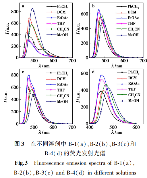 B-1~B-4在不同溶剂中的荧光发射光谱,如图3所示。B-1对溶剂极性较为敏感,随着溶剂极性的增加发射波长发生红移,存在较为明显的分子内电子转移效应。