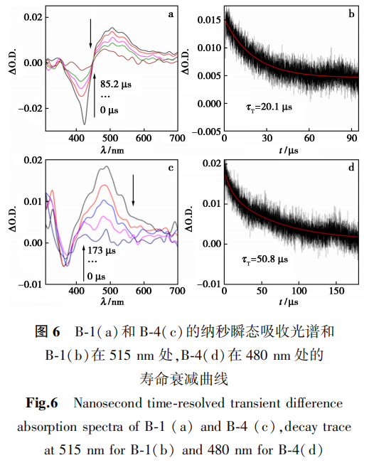 在B-1的瞬态吸收光谱中,其基态漂白峰位于408 nm处(图6a),与B-1的紫外-可见吸收光谱一致,同时在332 和450~700 nm范围内观察到了瞬态物种的吸收峰。在除氧的甲苯中,瞬态物种的寿命是20.1 ms;在氧气存在条件下,瞬态物种寿命淬灭至0.1 ms,说明B-1产生的瞬态物种是三重激发态[29,31, 35]。在除氧条件下,B-4在380~700 nm范围内出现瞬态吸收信号(图6c),与此同时在380 nm处观察到明显的基态的漂白峰(与B-4的紫外吸收相对应),瞬态物种的寿命为50.8 ms(图6d)。在不除氧条件下,该瞬态物种的信号明显减弱,说明B-4产生的瞬态物种也为三重激发态。