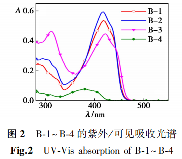B-1~B-4在甲苯中的紫外-可见吸收光谱如图2所示,B-1~B-4在300~320 nm的吸收带是HBT的烯醇式结构[31,32]。