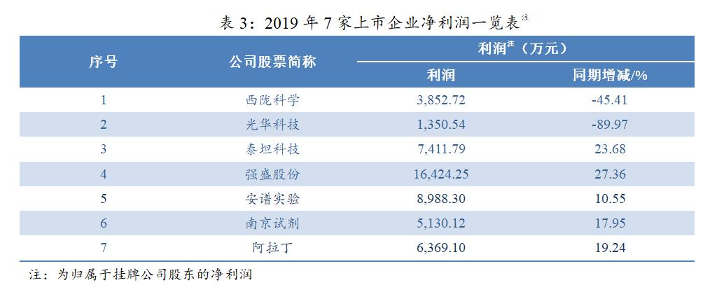 其中净利润和增幅最大的均是强盛股份,归属于挂牌公司股东的净利润为16,424.25万元,较去年同期增长27.36%,但增幅放缓。据其报告披露,因2019年销售额增长 3.6%,营业成本降低 2.6%,以及滨江化工在 2019 年取得高新技术企业证书带来的节税收益,致使净利润同比增加。光华科技同比下降89.97%,下降幅度较大,据公开资料显示,受外部宏观经济及产品结构的影响,该报告期内营业成本增加、销售费用、管理费用、研发费用、财务费用增加,随着国家技术中心研发大楼、电池正极材料生产车间等新项目建设完工投入使用,经营规模、融资规模增大,运营费用相应增加且加大了研发投入等多重因素导致净利润出现大幅度波动。另外值得一提的是,阿拉丁净利润增幅相较去年同期也出现了大幅度下降,由77.38%下降至19.24%,主要系其营业成本、研发费用、财务费用、营业外支出等费用增加所致。