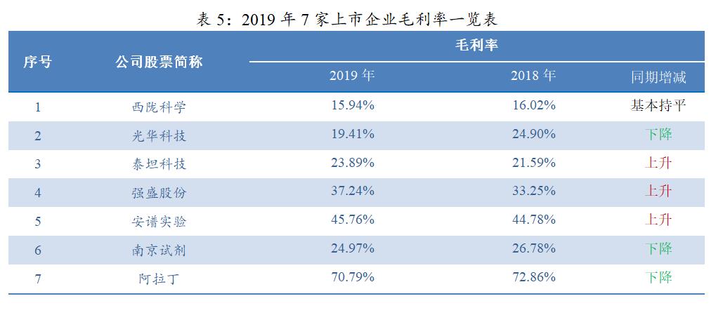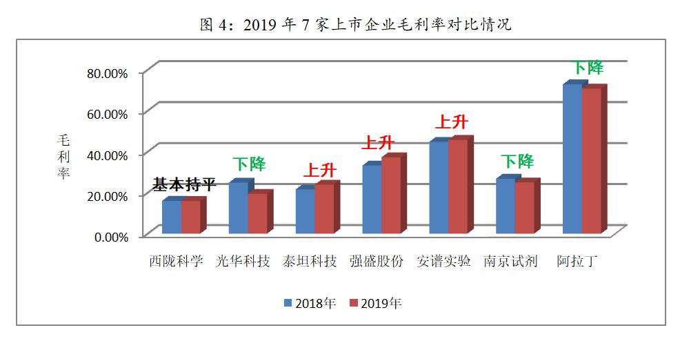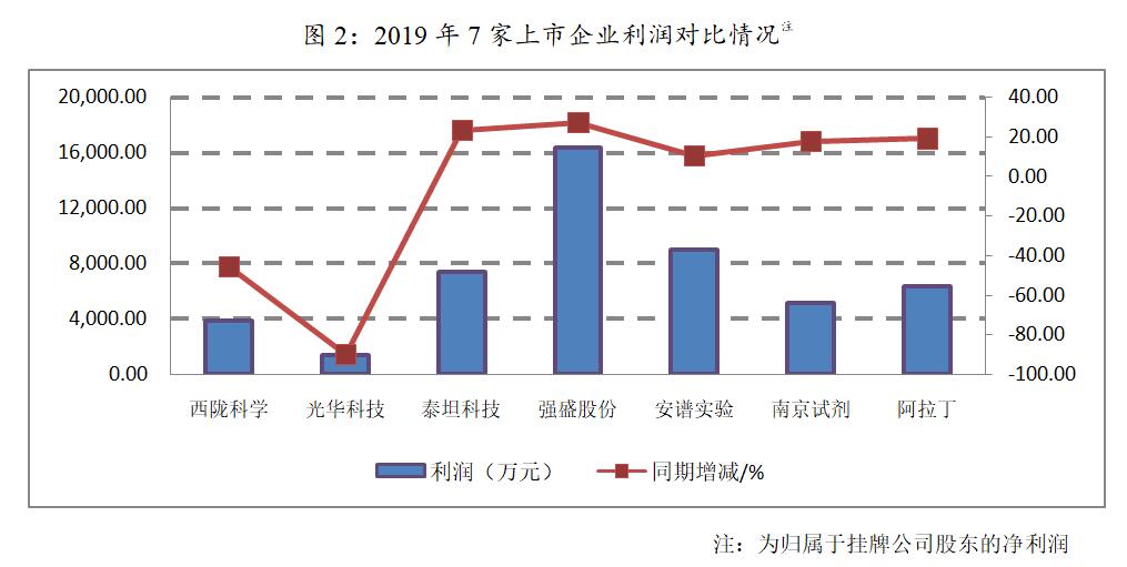 营业收入情况数据一览及对比情况详见表2和图1。其中,营业收入最高的是西陇科学,达到33.4亿元,但比去年同期下降0.52%。营收增幅最大的是南京试剂,比去年同期增长36.19%,增幅较2018年同期(15.43%)扩大,保持良好的增长态势。据其年报披露,主要系加大药用辅料及研发投入,供应链管理得到进一步改善,同时推动技术升级和产品结构优化,增强品牌影响力,优化车间生产工艺和生产模式,利用大数据提高效率、降低成本,促进了公司的整体经营状况。