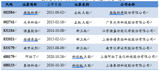 表1国内化学试剂行业部分上市公司基本信息一览表